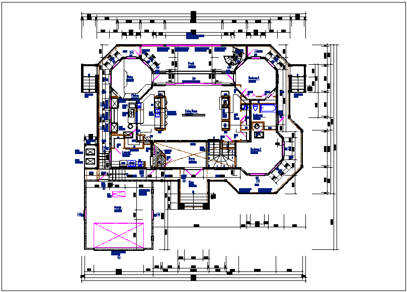 Bungalow plan view detail dwg file, Residential luxurious house plan view detail with design plan layout view, with dimension details, bedroom 1,2,3 , dining area, guest area, living room, toilet, wash area, kitchen, storage area, entrance etc