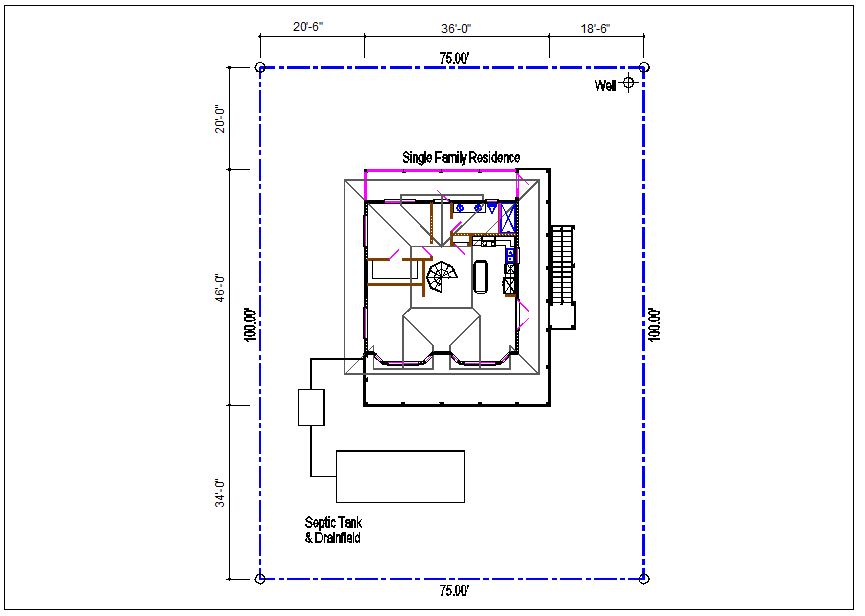 House top view detail dwg file, House top view and design plan layout view with dimension detail, septic tank system, roof floor projection view