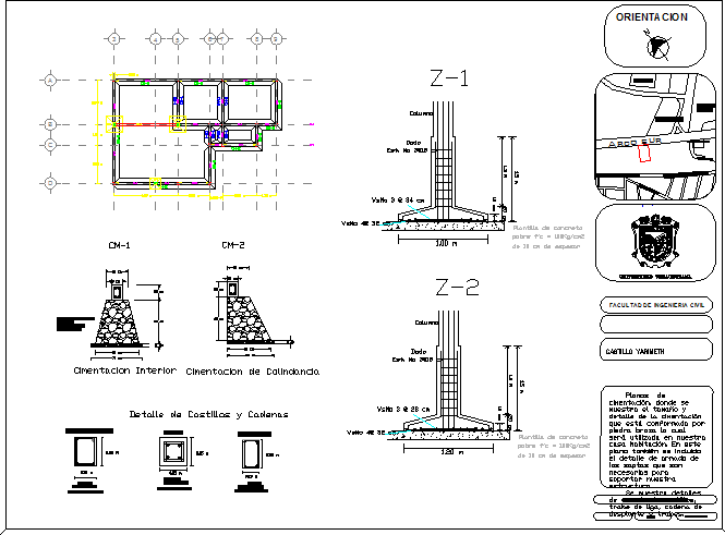Foundation plan details of building that includes a detailed view concrete template, interior foundation, foundation of coexistence, details of castles and chain, armed concrete chain and much more of foundation plan details.
