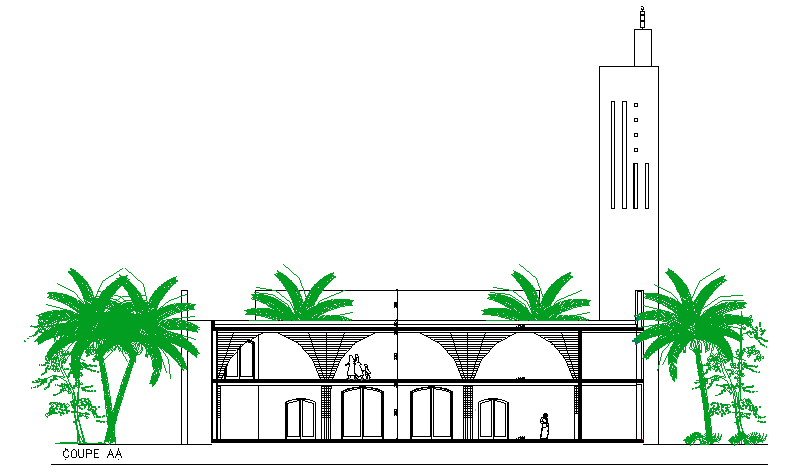 Side sectional view of religious city mosque that includes floor view, column and beam view, doors and windows view, tree view, wall design, tomb view, pillar view and much more of mosque design.