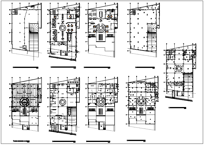 Office building plan view detail dwg file, Office building plan view detail and design plan layout view detail, floor plan detail, ground floor, 1st floor to 4th floor plan view detail, foundation plan layout, roof floor plan view, semi spiral stair view etc