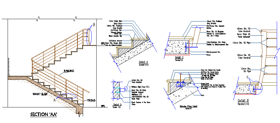 Staircase construction details of apartment flats that includes a detailed view of supportive column and beam construction, wooden railing, steps construction, concrete cement plan, floor construction and much more of staircase construction details.
