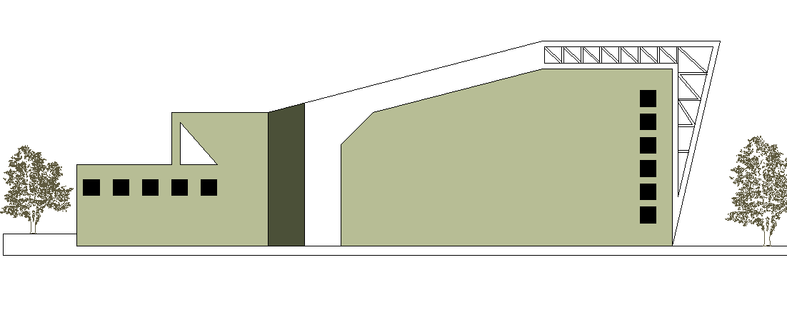 City auditorium hall main elevation details that includes a detailed view of building front view, tree view, roof or terrace view, doors and windows view and much more of auditorium hall elevation.