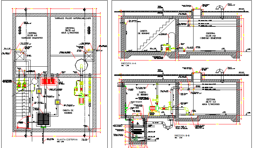 Water tank of building constructive details that includes a detailed view of cistrena plan, tank, domestic consumption, pipe from rebose to pump chamber, rebose box see details, pump chamber view details and much more of water tank details.