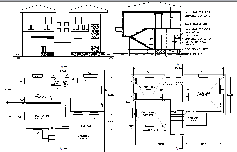 Two flooring bungalow architecture project that includes a detailed view of elevation, back elevation with doors and windows, floor view, section view with wall design and indoor staircase details, structure details like family hall, kitchen, dining area, bedroom and much more of bungalow design.