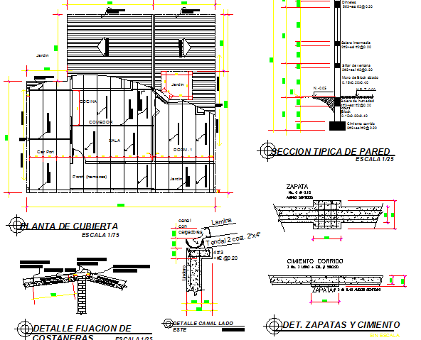Single family house architecture project that includes a detailed view of foundation plan details, wall construction details, roof construction, floor construction, column construction, beam construction and much more of house project details.