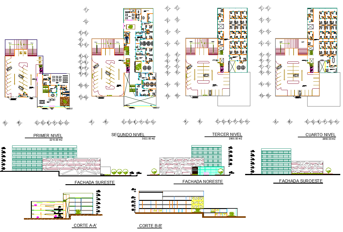 Office building plan elevation detail view dwg file