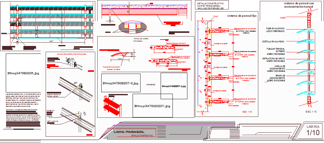 Construction details of transverse cutting parasol anchor that includes a detailed view of, Fixed sunshade system, detail of parasol plant, types of parasol plant, front view parasols, anchor of parasol to parante by profile of iron, union of parasoles to metal parante by profiles and bolts, assembling the sunset system.