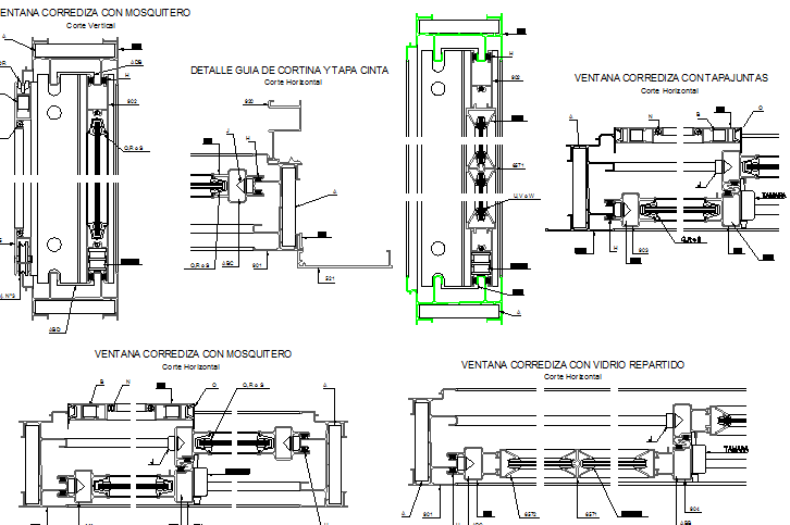 A fixed cloths of doors and window installation details that includes a detailed view of Common curtain guide detail, (For curtain neighborhood: 6065), Central meeting detail 4 sheets, window and sliding door with 2 and 4 leaves, Detail of distributed glass, Vertical cut, Optional and much more of doors and window installation details.