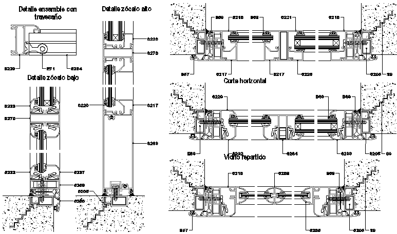 A window to open com camp details that includes a detailed view of Common curtain guide detail, (For curtain neighborhood: 6065), Central meeting detail 4 sheets, window and sliding door with 2 and 4 leaves, Detail of distributed glass, Vertical cut, Optional and much more of doors and window installation details.