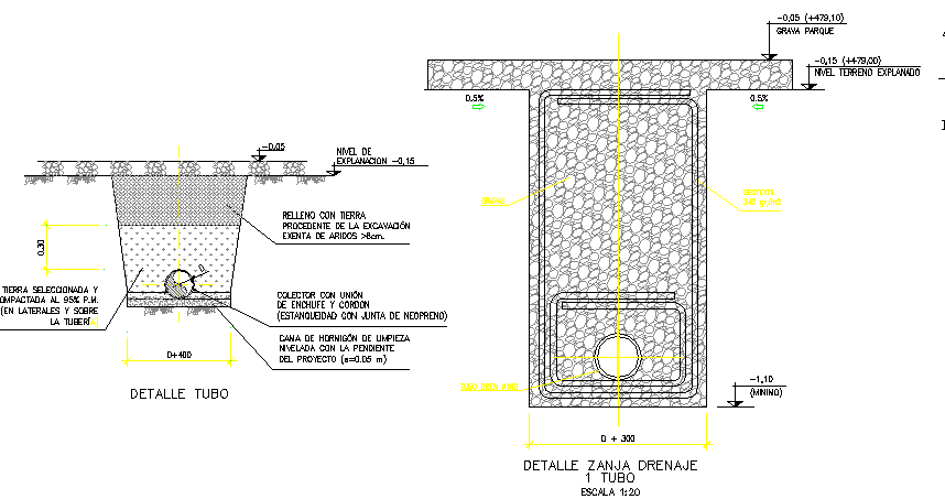 Drainage trench architecture project details that includes a detailed view of filling with earth from the excavation exemption of aridos, collector with plug and cord union, explaned terrain level and much more of drainage details.