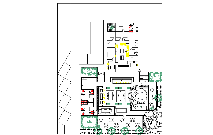 layout plan of a office dwg file, here there is a top view layout plan of a office , modern design layout, sitting area,furniture detailing etc