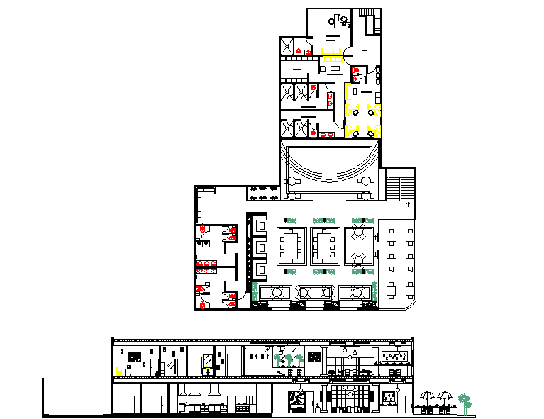 layout plan of a office dwg file and elevation details of a house, here there is a top view layout plan of a office , modern design layout, sitting area,furniture detailing etc