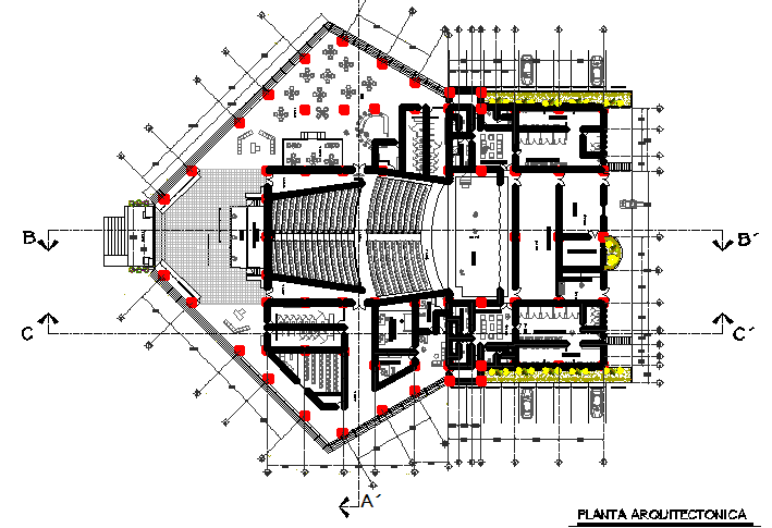 layout plan of a of building dwg file, here there is a top view layout plan of a building , containing vast seating area , banquet design, spacious concept ,modern design layout, sitting area,furniture detailing etc