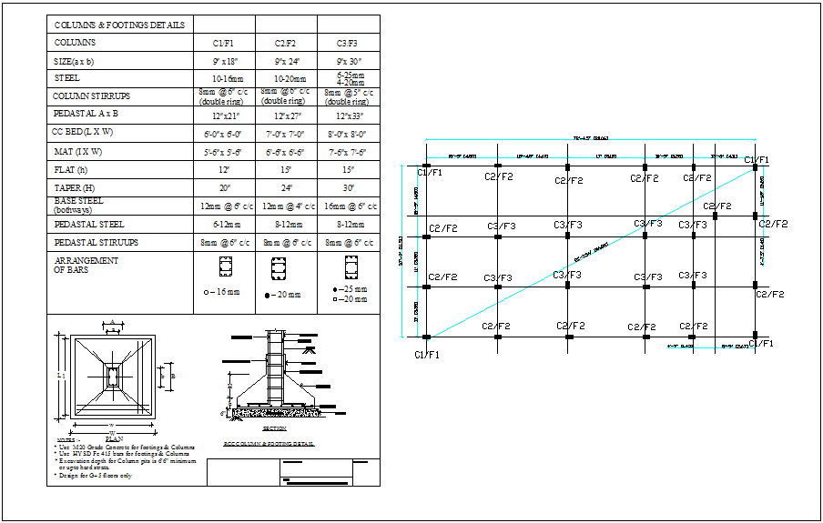 Column foundation specification and plan view detail dwg file, Column foundation specification and plan view detail with design plan layout of column footing, foundation specification and dimensions detail view, column size and dimension detail, reinforcement detail etc