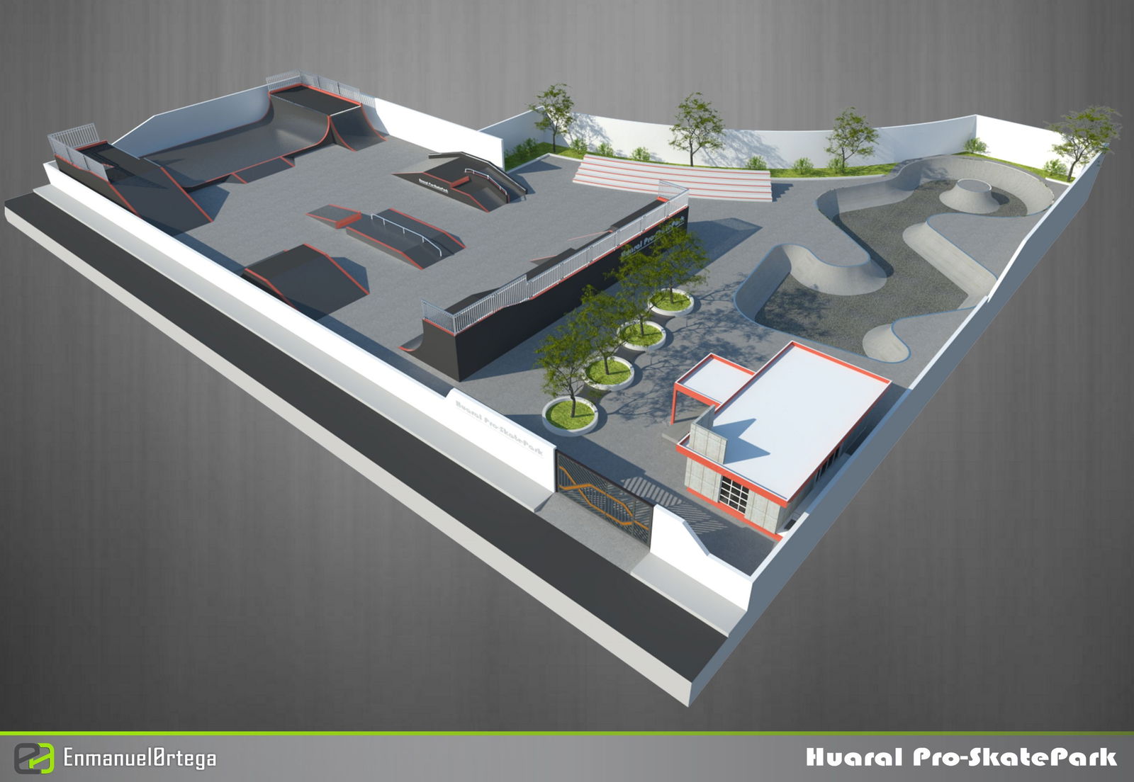 3D Skate Park CAD Layout with 65m Ramp Zone and Bowl Section