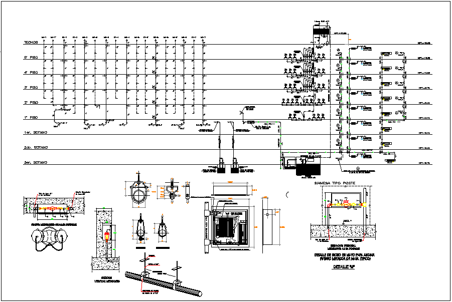 Office building water pipeline and plumbing connection detail dwg file, Office building water pipeline and plumbing connection detail with specification detail, legends detail, section view detail of walls and pipe connections etc