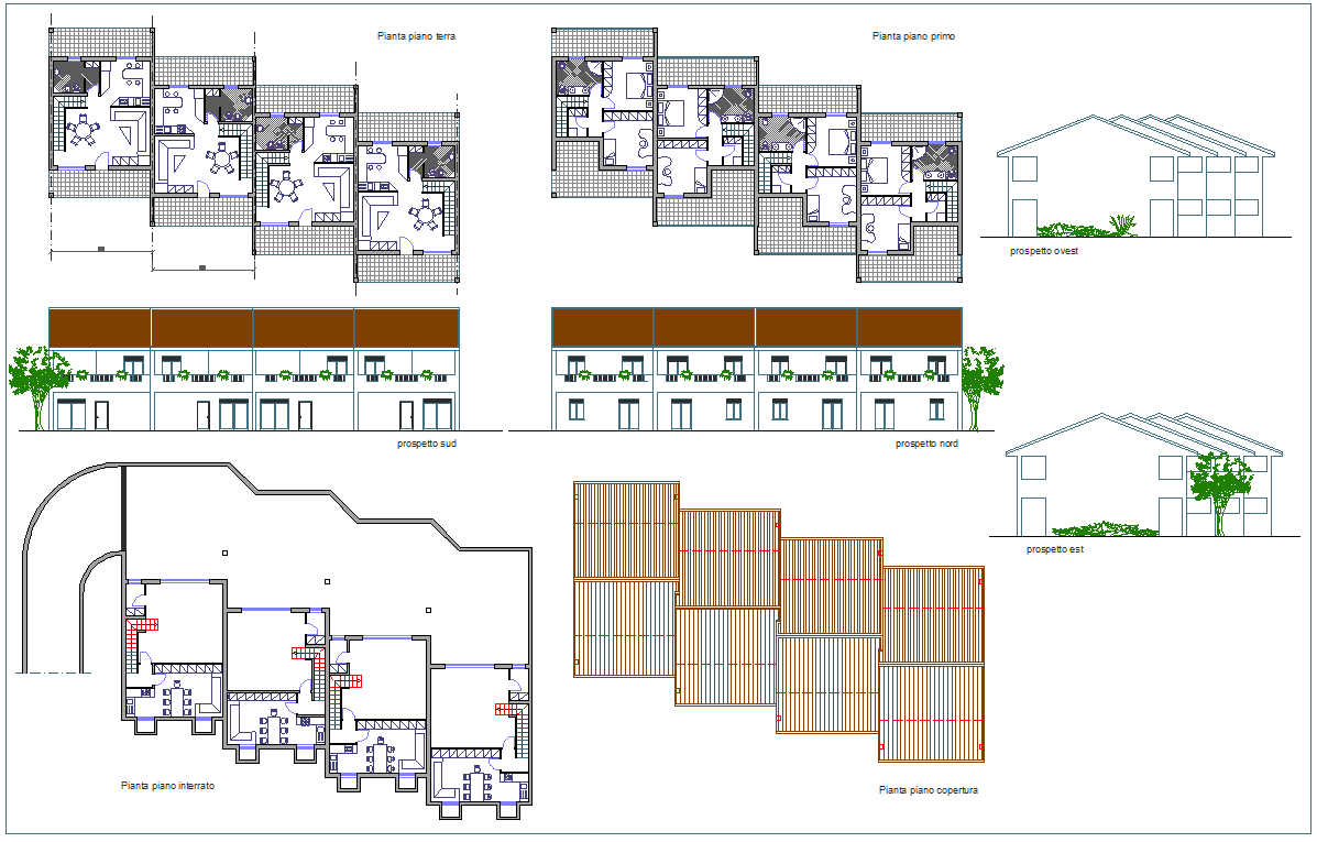 The sectional and elevation drawings provide additional clarity, presenting south, north, east, and west façades with pitched roof sections, window placements, and landscaped boundary integration. A basement layout is also included, showcasing underground rooms and circulation areas connected by internal stairs for efficient vertical movement. The roof plan illustrates the segmented roof panels arranged uniformly across all row house units. These well-detailed DWG files are ideal for architects, civil engineers, interior designers, and 3D modelling professionals engaged in residential planning, documentation, BIM conversion, and visualisation. The drawing supports concept development and final design presentations for row housing projects.