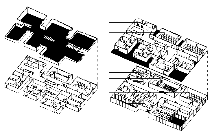 Isometric view of multi-flooring city school building that includes a detailed view of main entry door, top view, staircase view, class rooms, library, play ground, computer lab, cafeteria, staff room, head office, toilets and bathroom and much more of school project.