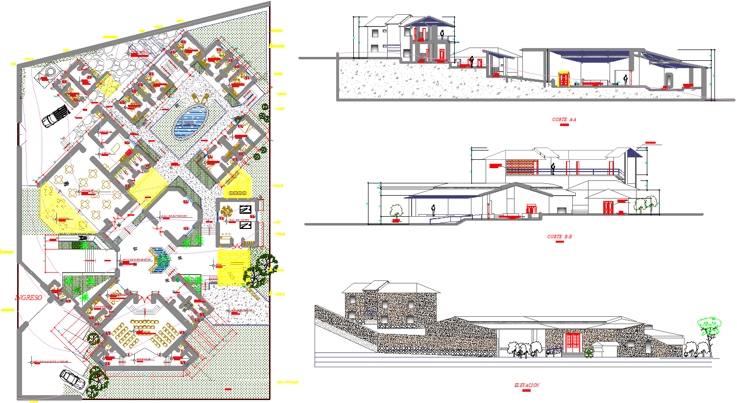 The included A–A and B–B sectional drawings highlight varying roof heights, structural supports, contour adjustments, shading elements, and façade treatments. The elevation view displays a stone-textured exterior, stepped site design, and interconnected built zones suited for high-traffic tourist facilities. This DWG file is ideal for architects, interior designers, civil engineers, builders, AutoCAD and Revit users, SketchUp modelers, and landscape planners who want ready-to-use drawings to accelerate project development. Subscribe to Cadbull to download this complete recreational complex layout and integrate professional detailing into your next tourist or leisure project.