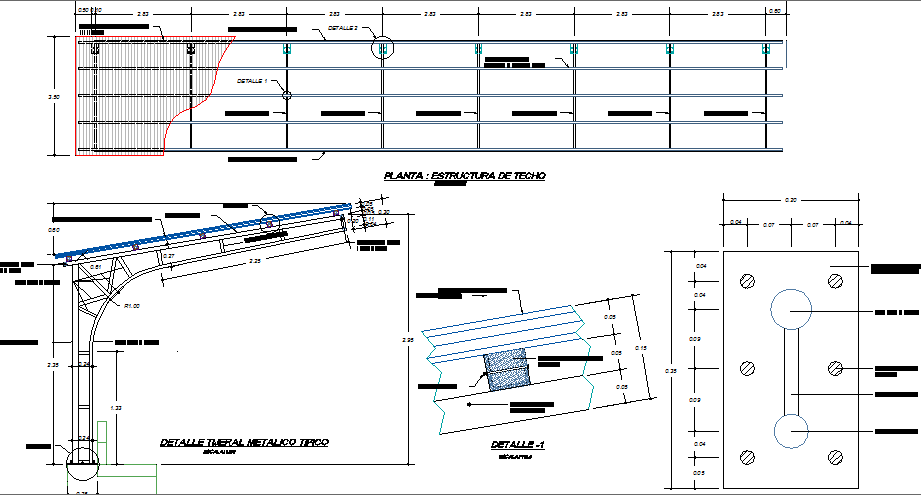 Tribune stage coverage roof structure details that includes a detailed view of coverage with polypropylene, channel pluvial, tube details, metallic details, bolt detail metal double tribune, wooden strap or similar and much more of roof structure details.