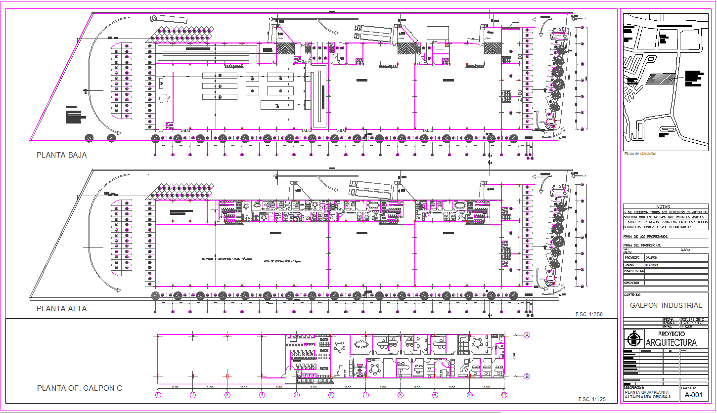 The upper-floor plan features administrative rooms, technical service stations, machine control areas, employee amenities, and corridor networks that support a smooth industrial layout. The office block plan integrates open workspaces, private offices, meeting rooms, restrooms, and dedicated staff areas, perfectly aligned with the industrial warehouse plan below. Additional DWG elements, such as workstation details, column grids, site location maps, service notes, and vehicular flow diagrams, enhance the accuracy of this detailed DWG industrial facility drawing. Whether for manufacturing, logistics, or commercial processing, this modern workflow warehouse design provides a complete, efficient, and scalable solution for professional users.