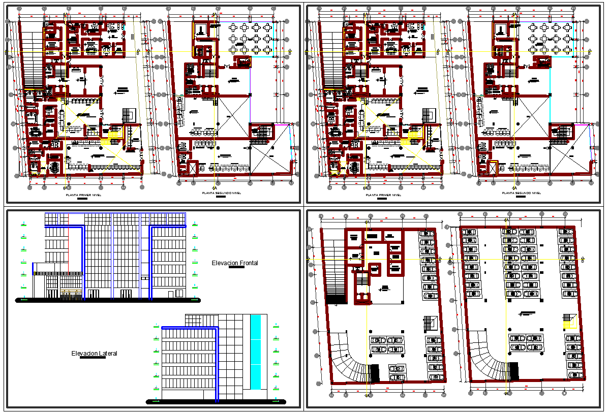 Corporate building plan detail dwg file, corporate building plan detail and design plan layout of each floor with specification detail, corporate office building view, elevation and section view detail etc