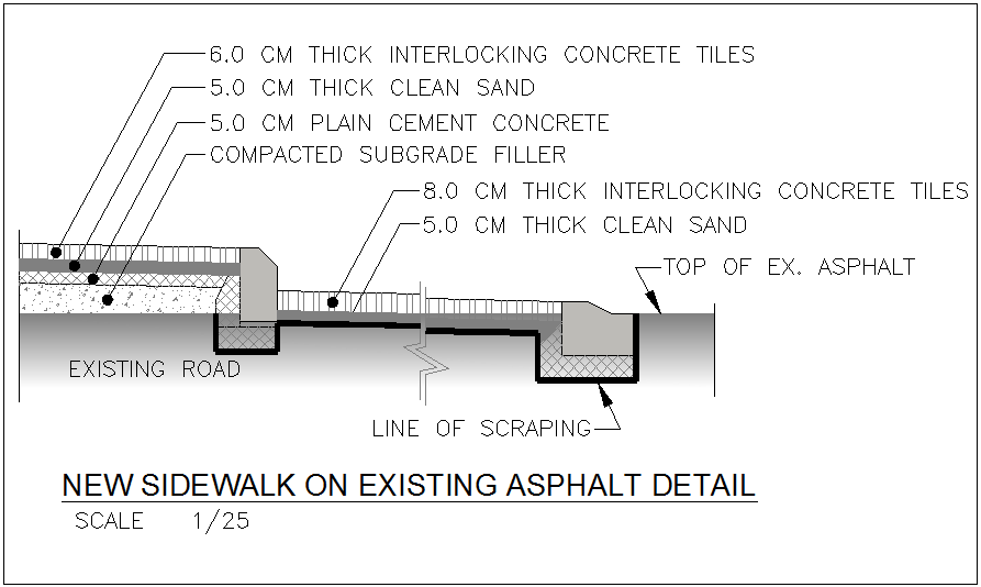 Side walk detail with construction view dwg file in detail view with concrete tile and asphalt view.