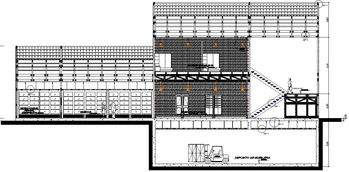 Big showroom elevation details dwg file, this auto cad file contains 2d elevation detail of a showroom , detailing of glass is shown, staircase design etc