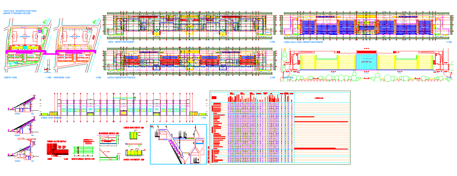 The second sheet contains detailed side sections showing the vertical composition of the sports stadium layout, including staircases, seating gradients, roof canopy steel profiles, and player circulation paths. Each level appears to maintain a clear height of 4m to 5m, allowing proper airflow and crowd visibility. The DWG also features material schedules, reinforcement details, and construction annotations essential for professional implementation. These stadium DWG drawings serve as high-value references for architects, civil engineers, and designers exploring innovative stadium architecture, offering complete insights into planning, structural execution, and seating design.