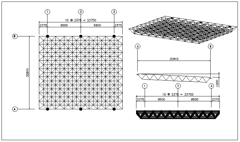 Space frame layout and support location detail view dwg file, Space frame layout and support location detail view with loading data
