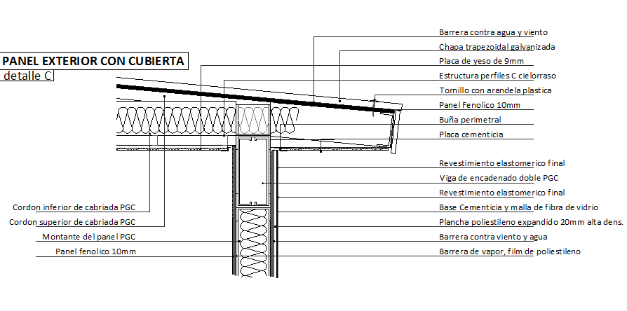 Outer panel with plate construction details that includes a detailed view of Final elastomeric coating, Cementicia base and fiberglass mesh, Expanded polystyrene sheet 20mm, Barrier against wind and water, Ceramic exterior, Bulldozer folder on sub floor, Non-structural poor concrete sub floor, Vapor barrier, polystyrene film, 10mm phenolic panel and much more of steel frame details.