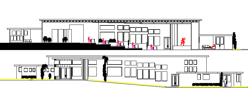 Elevation and section details of Art gallery with theaters and restaurant dwg file.