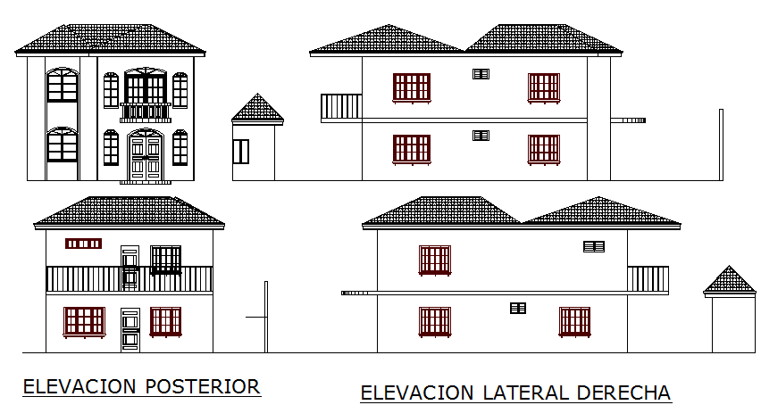 Two level single family house all sided elevation details that includes a detailed view of front elevation, back elevation, side elevations, doors and windows view, roof or terrace view, balcony view, staircase view of house elevation details.