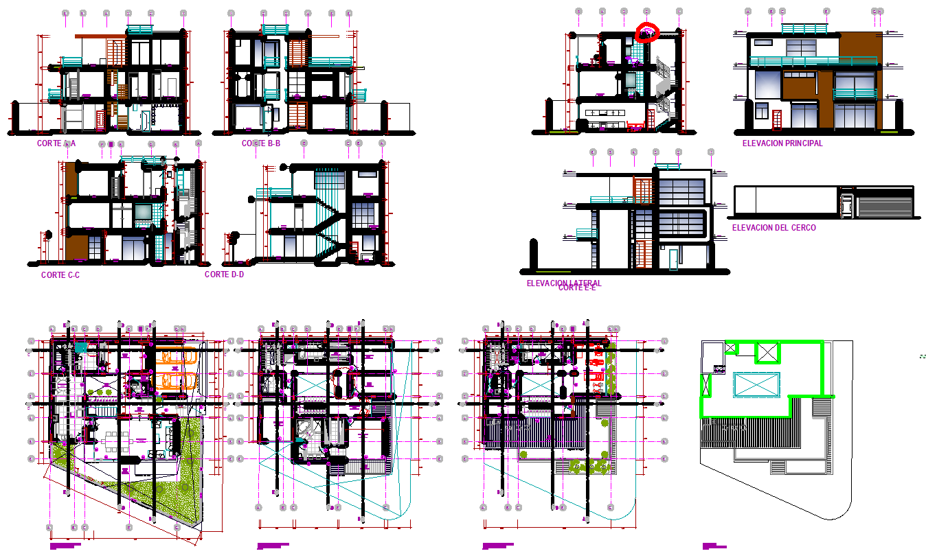The sectional drawings A-A, B-B, C-C, and D-D provide clear insight into the bungalow’s vertical distribution, slab heights, stair geometry, door window placements, and interior height relationships. The principal elevation and lateral elevation illustrate the modern façade treatment with clean lines, glazing, shading components, and material transitions. This DWG file is ideal for architects, civil engineers, interior designers, builders, and students who require a well-detailed reference for residential bungalow design. It supports concept development, technical detailing, layout optimization, and complete documentation for modern family homes.