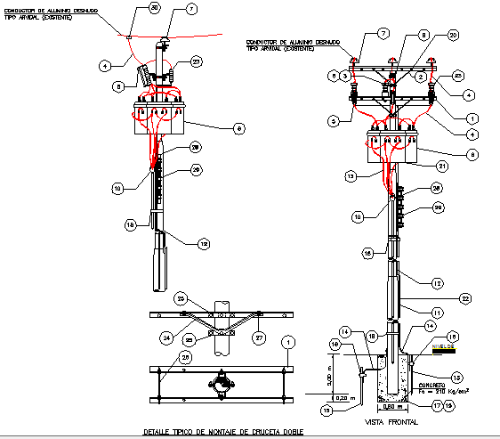 Architecture details of post derivation that includes a detailed view of aluminium driver nude Vidal type existing, front view, typical detail of double cross mounting, list of material post of transformation and much more of post derivation details.