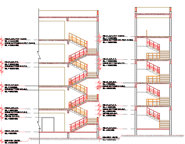 Staircase Details of multi-flooring building that includes a detailed view of flooring view, supportive column and beam view, steps details, supportive wall view, terrace view and much more of staircase details.