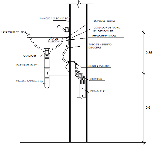 Sink installation details of bathroom that includes a detailed view of packaging support hanger, fixing bolt, copper asbestos tube, pressure elbow, fixing nail, trap bottle and much more of sink installation details.