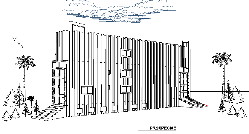 Side elevation view of multi-flooring corporate building that includes a detailed view of front view with staircase view, tree view, flooring view, balcony view, doors and windows view, main entry gate, terrace view and much more of building elevation.