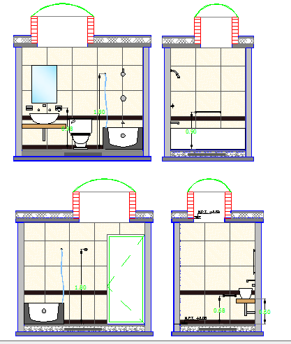 Sanitary installation details of house project that includes a detailed view of section view, with doors and ventilation, sink view, toilet sheet view, bath tub view, wall design, lobby and much more of sanitarian installation details.