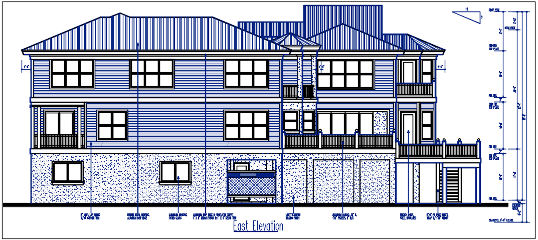 East direction elevation detail dwg file, House plan elevation detail with naming door, window, large door, reeling and all dimension floor detail of the dimension details, etc.