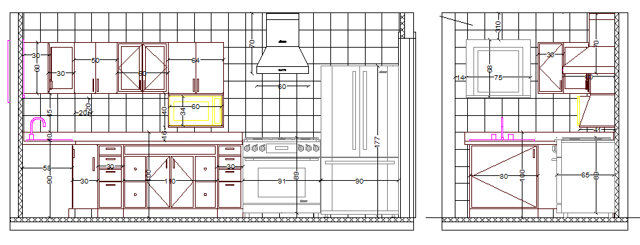 kitchen of house architecture project that includes a detailed view of doors and window view, wall design, chimney view, wardrobe view, platform view, floor design and much more of kitchen details.