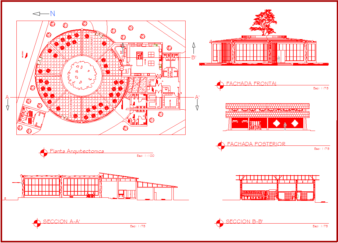 The drawing set includes façade front, façade rear, and detailed sectional views A A and B B, illustrating roof slopes, glazing patterns, column spacing, and material layering. The 32m circular restaurant layout enables natural light distribution and enhances customer flow throughout the space. The DWG file also offers landscape elements, structural wall layouts, door window placements, and scale indicators to ensure precise execution. Fully compatible with AutoCAD, Revit, 3ds Max, and SketchUp, this restaurant DWG design allows subscribers to customize, visualize, and develop refined hospitality projects with architectural clarity and efficiency.
