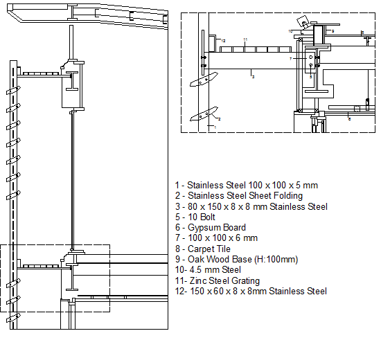 Pat steel system details that includes a detailed view of stainless steel, stainless steel sheet folding, bolt, gypsum bolt, carpet tile, oak wood base, zink steel grating and much more of steel details.
