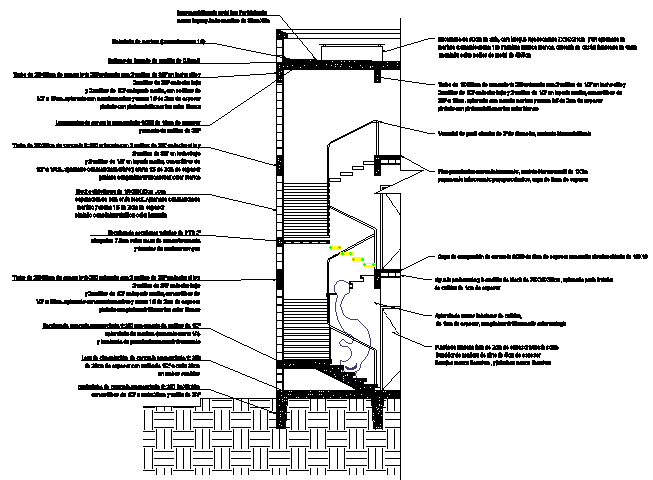 Cutting by Staircase Facade construction details that includes a detailed view of floor vise construction details of step construction, footings of staircase, material used details, cuts, measures and much more of staircase details.