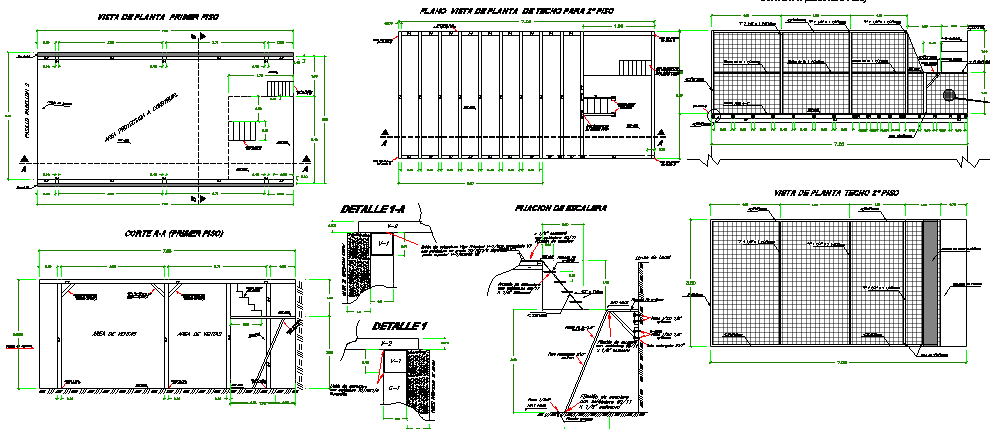 Two flooring commercial shop construction details that includes a detailed view of first floor cut, sales area, projected area to build, view of first floor plant, plane view of ceiling floor for second floor, cut second floor, ladder fixing and much more of commercial shop details.