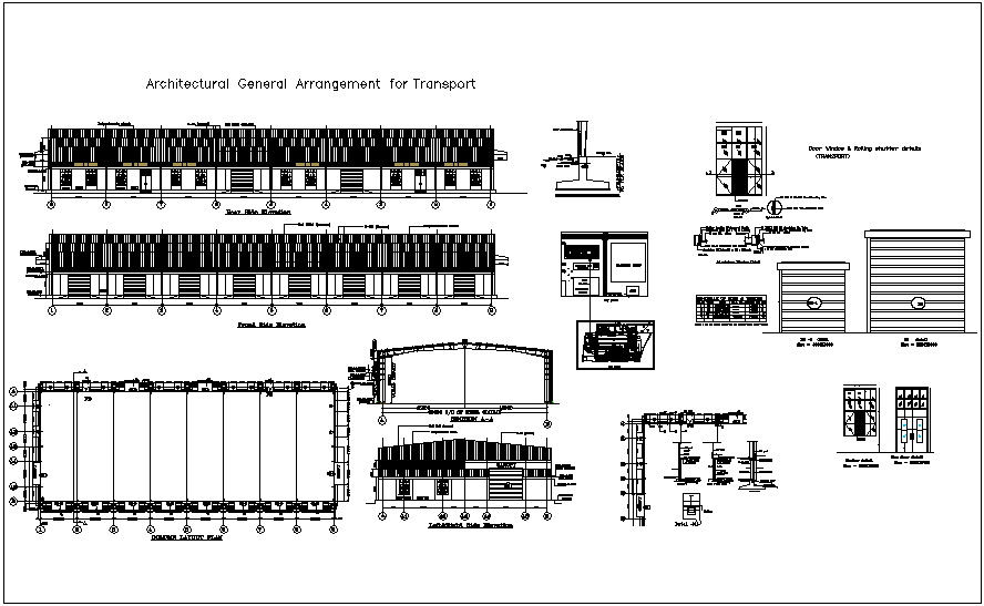 Structural view for transport design dwg file in elevation with view of window and fire door view and plan of column layout with column view and necessary dimension and