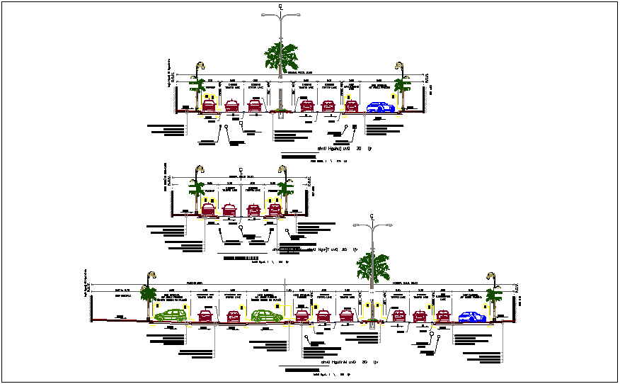 road,walking way,traffic lane,tree and street light view and under ground view of potable water,waste water and electric line with necessary dimension.