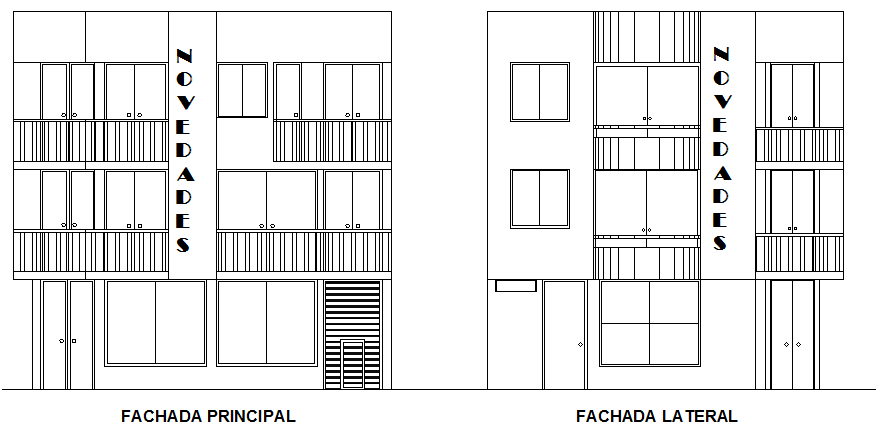 Front and back elevation of multi-flooring bungalow dwg file.