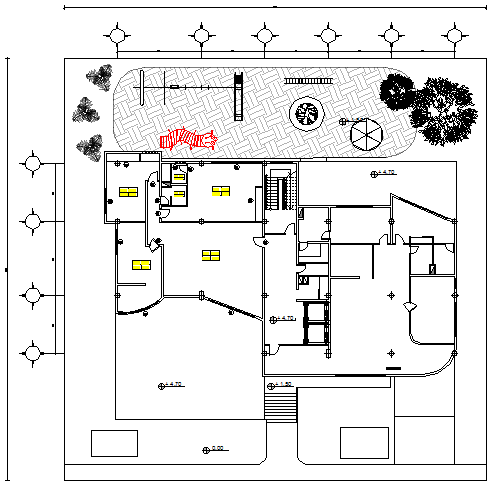 Multi-family residential building house architecture layout that includes a detailed view of main entry door, family hall, living room, kitchen, dining area, bedroom, master bedroom, indoor cafeteria, terrace, toilets and bathroom and much more of house layout plan.